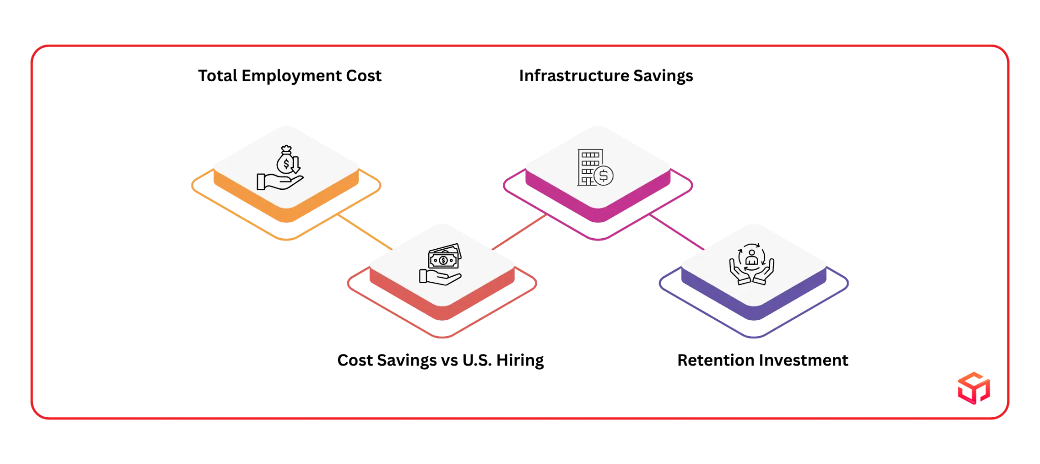 • Total Employment CostCompanies must account for benefits, payroll taxes, compliance obligations, and administrative overhead, which typically add 30–40% beyond base salary.
