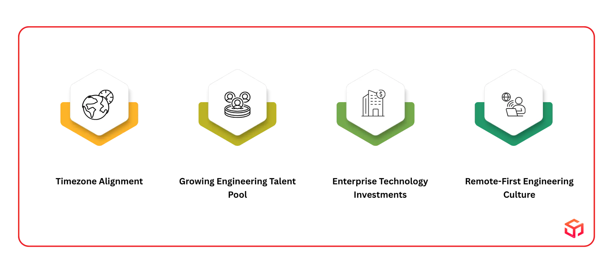 Mexico has become one of the fastest-growing nearshore markets due to collaboration advantages, increasing enterprise investments, and the rising demand for distributed engineering teams supporting North American businesses.