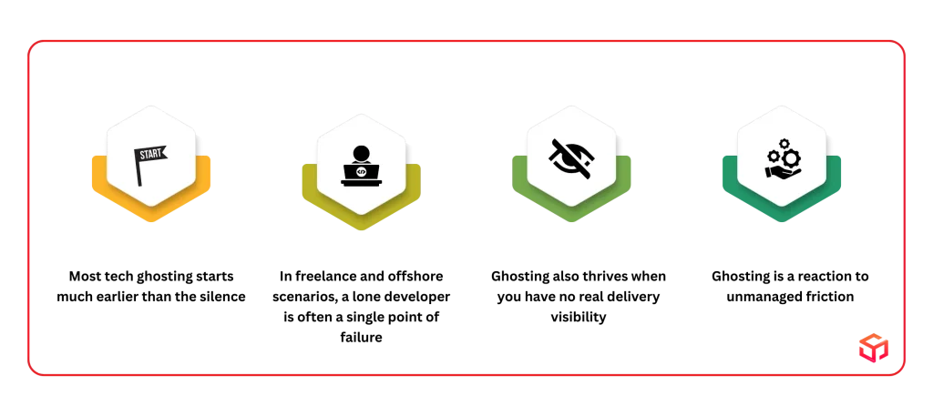 Remote and offshore development introduces distance, time zones, and lower visibility, which boosts existing hiring and delivery weaknesses. To prevent ghosting, you first need to understand why it actually happens.