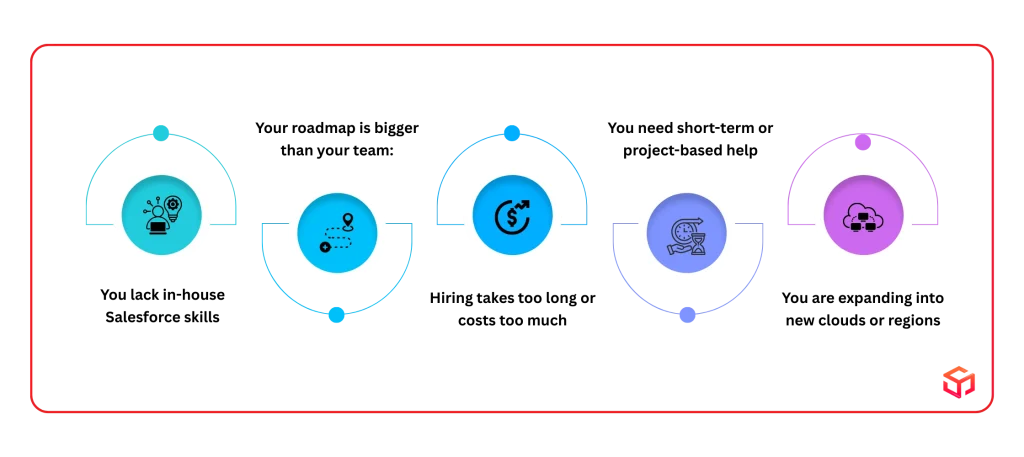 • You need short-term or project-based help: You only need heavy Salesforce work for a limited period, so hiring permanent staff does not make financial or operational sense.