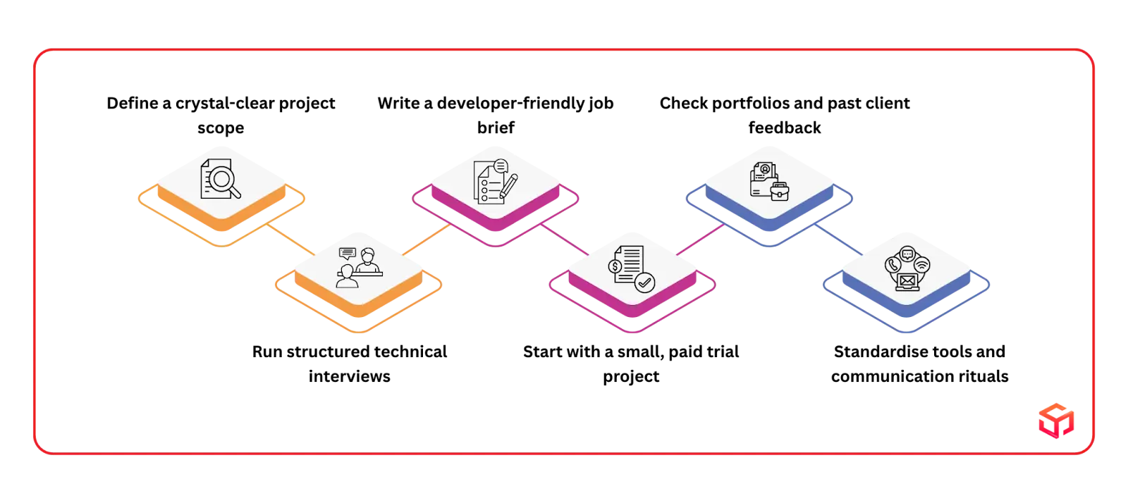 • Start with a small, paid trial project: Use a separate module, feature, or refactor to validate quality, communication, and ownership before scaling the engagement to critical-path workstreams.